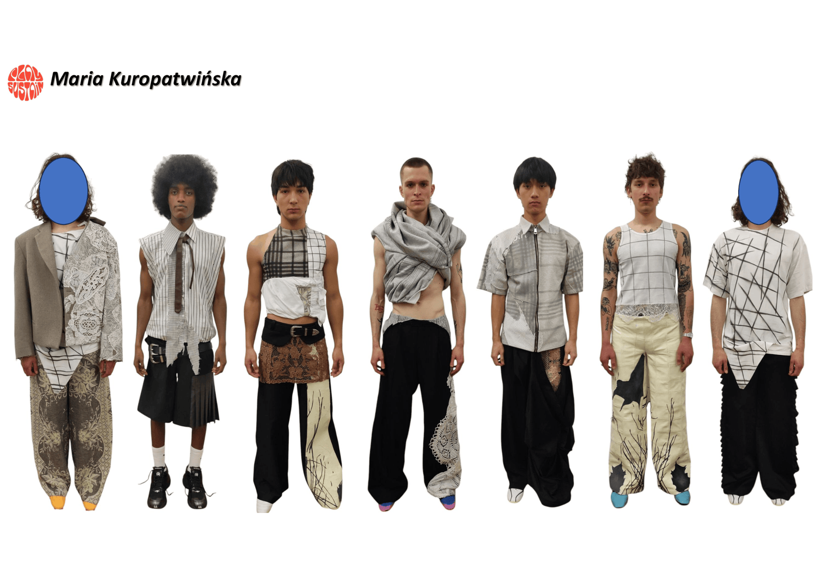 – projekt 7-sylwetkowej, spójnej kolekcji, zaprojektowanej z wykorzystaniem tkanin i ubrań z drugiego obiegu; kolekcja powinna zostać zaprezentowana na 8 ilustracjach wykonanych dowolną techniką (odręczne rysunki, materiały digitalne, kolaże, techniki mieszane), prezentujących każdą sylwetkę 1-7 'od stóp do głów’ na oddzielnej ilustracji; 8 ilustracja powinna zawierać zestawienie sylwetek całej kolekcji konkursowej,