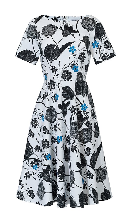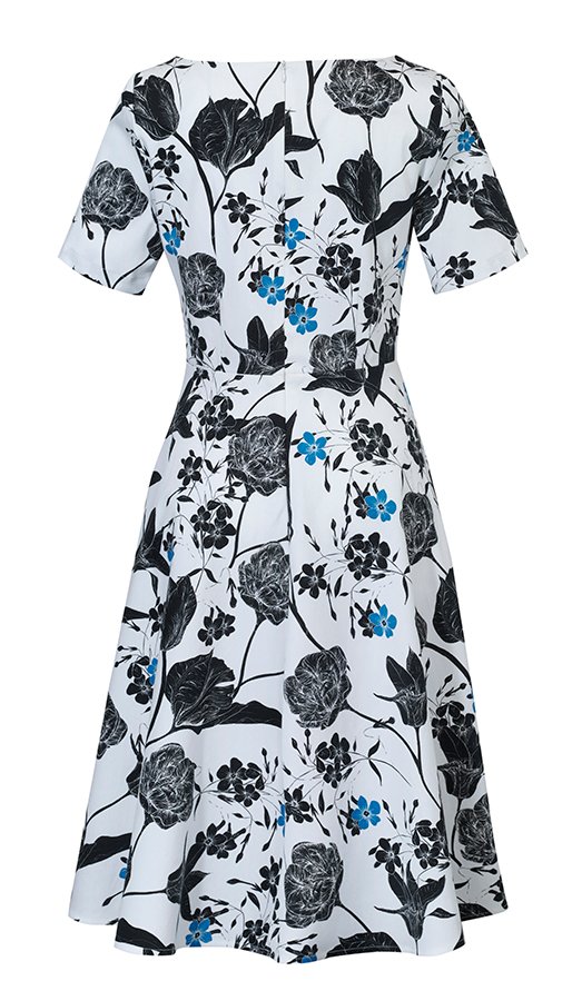 Urocza letnia sukienka z rozkloszowanym dołem. Stonowany wzór nawiązujący nieco do tradycji japońskiej nadaje jej elegancki charakter. Doskonale sprawdzi się zarówno w upalny dzień jak i na wieczorne spotkania z przyjaciółmi. Krótki rękaw. Odcinana w pasie. Zapinana z tyłu na kryty suwak.