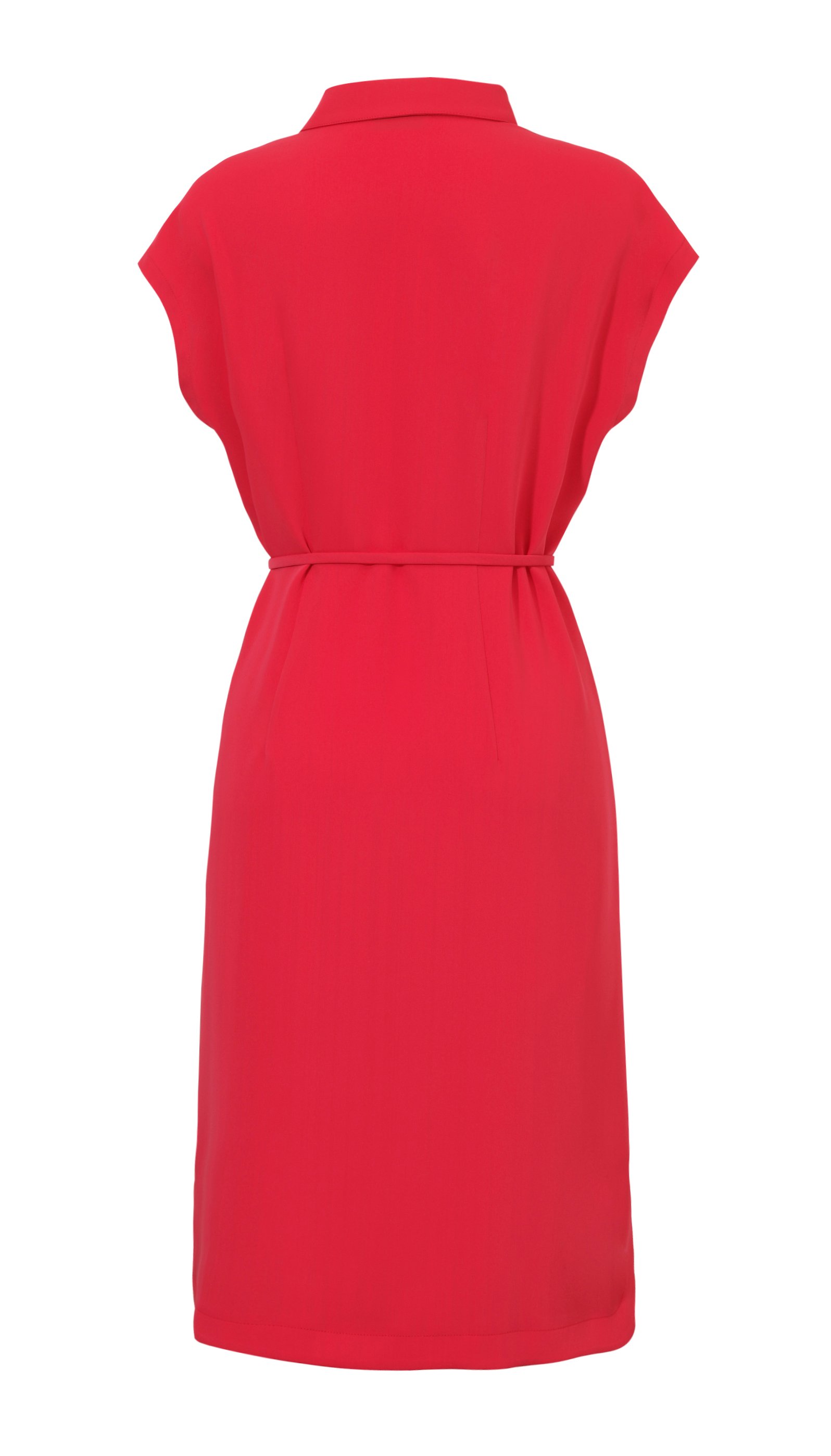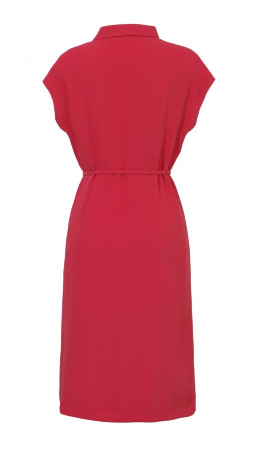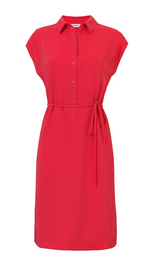 Sukienka z zapięciem polo w żywym czerwonym kolorze, który sprawi, że nawet pochmurny dzień będzie udany. Fason ołówkowy. Zaokrąglone rozcięcia po bokach. Bez rękawów. Zapięcie polo na guziki. Pasek makaronik w talii.