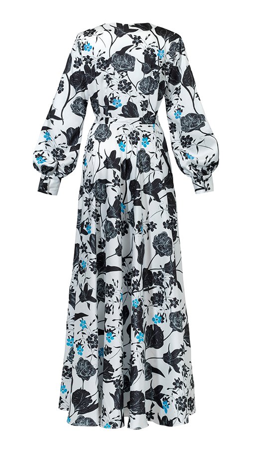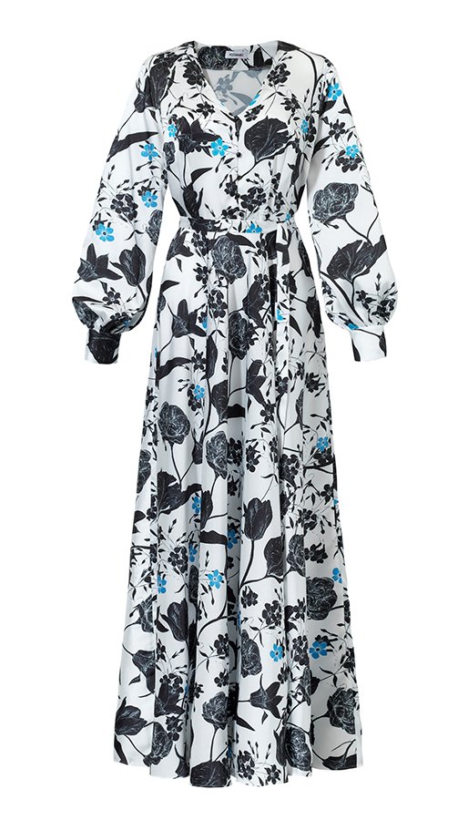 Spektakularna długa sukienka na wyjątkowe okazje. W takiej sukience można wybrać się zarówno na spacer do parku jak i na wieczorne wyjście. Elegancki stonowany wzór. Odcinana w pasie z szerokim dołem. Długość do kostek. Długi rękaw z mankietem zapinanym na 2 guziczki. Przód również zapinany na urocze małe guziki. Kryty suwak w bocznym szwie.