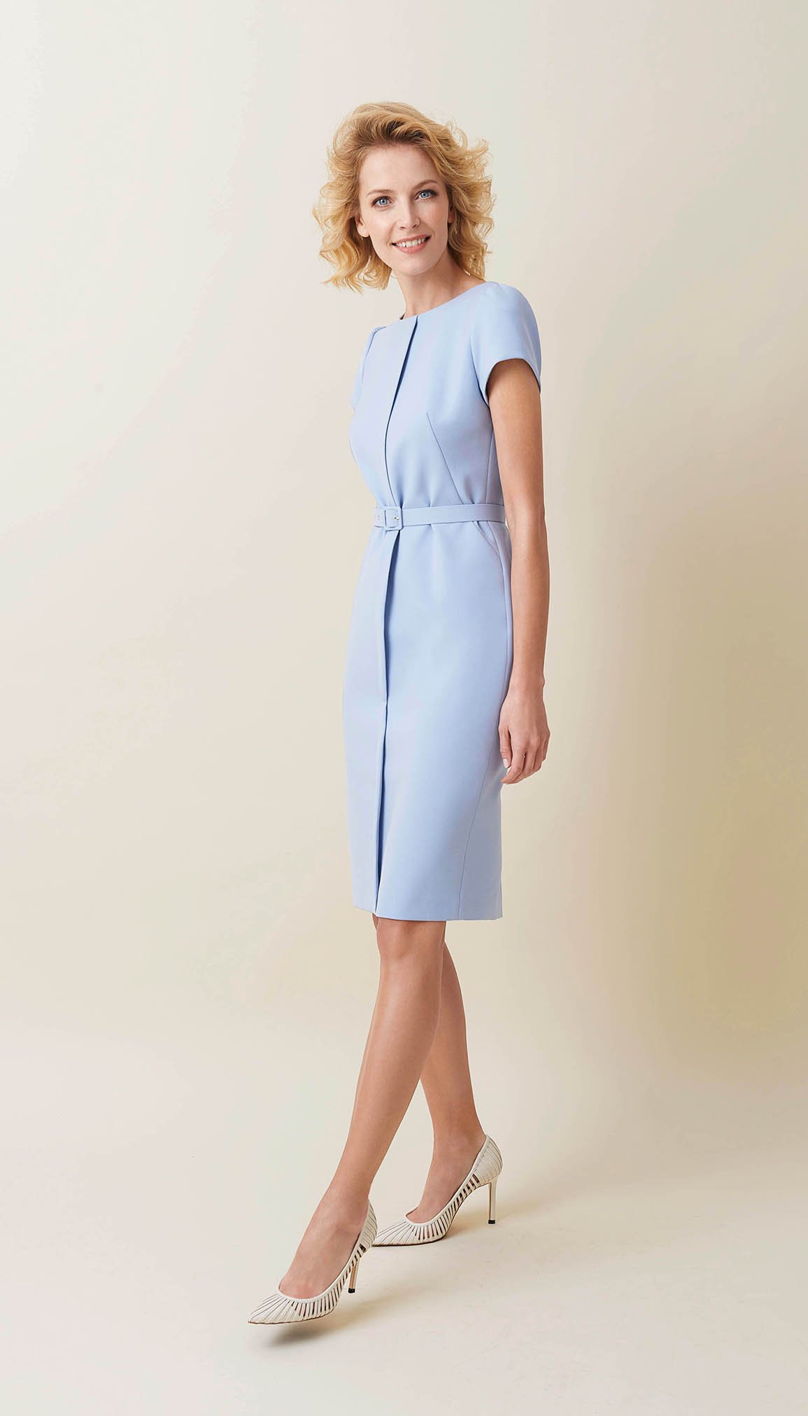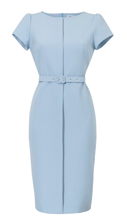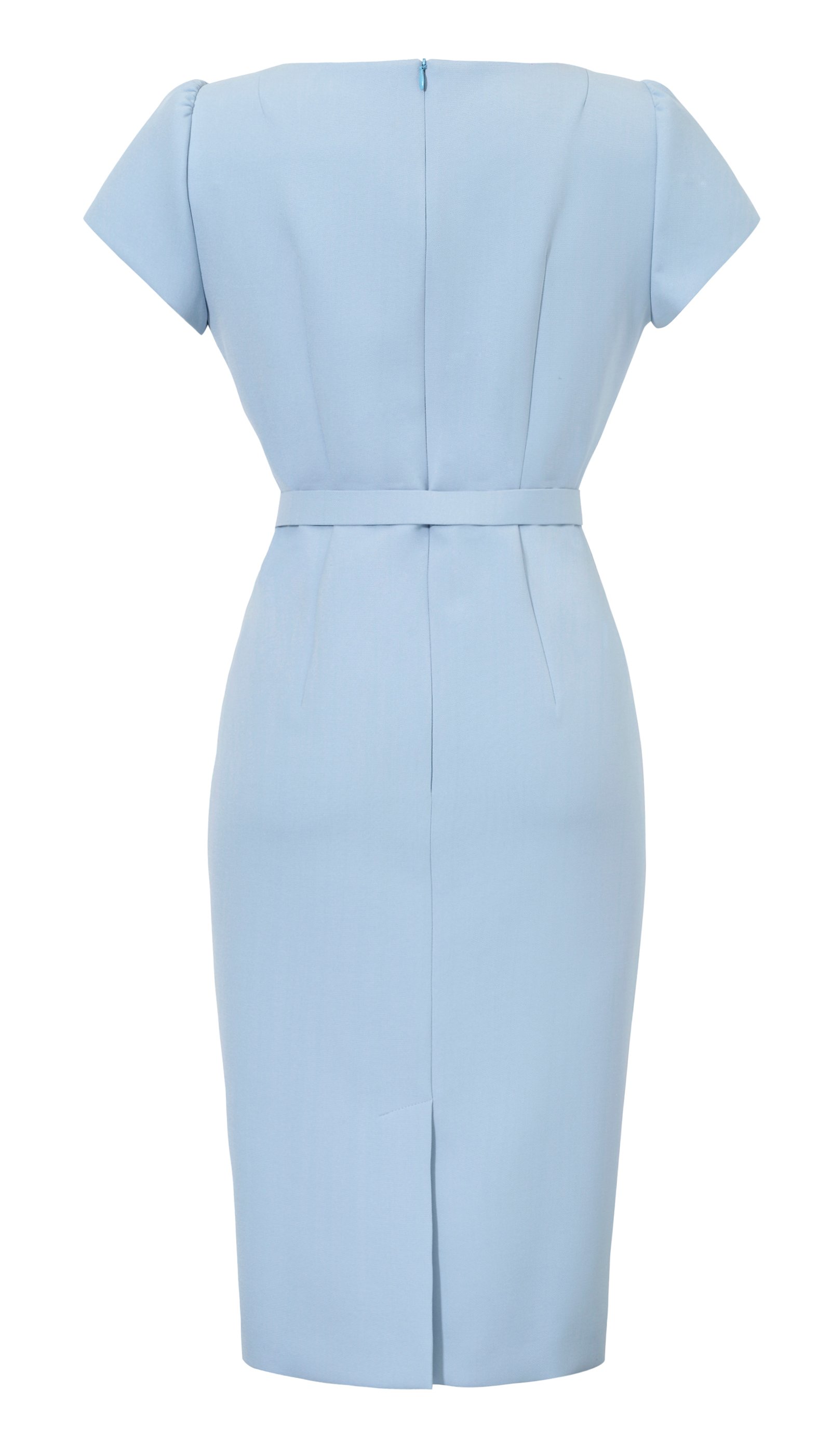 Elegancka ołówkowa sukienka w pięknym niebiesko-szarym kolorze wykonana z doskonałej mieszanki włókien. Must-have w szafie każdej kobiety. Ta sukienka sprawia, że wychodzisz z domu pewna siebie i z zadowoleniem chwytasz pełen uznania wzrok napotkanych osób. Jesteś królową dnia! Głębokie ukośne zaszewki. Plisa z przodu. Krótkie rękawy. Zapięcie z tyłu na kryty suwak. Dodatkowo obciągany paseczek w talii.