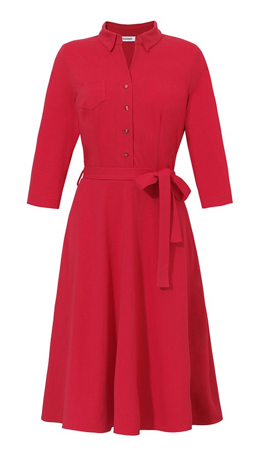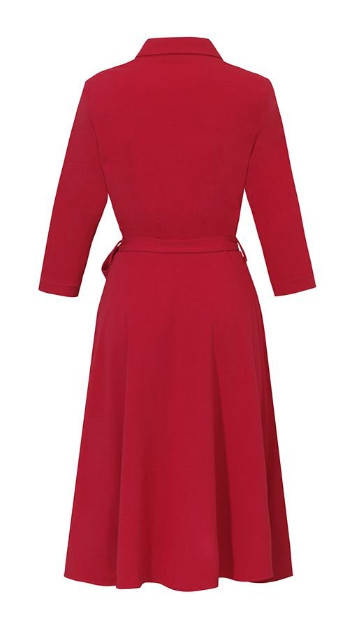 Sukienka szmizjerka w pięknym czerwonym kolorze. Przewiewna tkanina bawełniana sprawi, że nawet w upalne dni będziesz się czuła komfortowo. Odcinana w pasie z rozkloszowanym dołem. Rękaw o długości 3/4. Suwak w bocznym szwie. Pasek w talii.