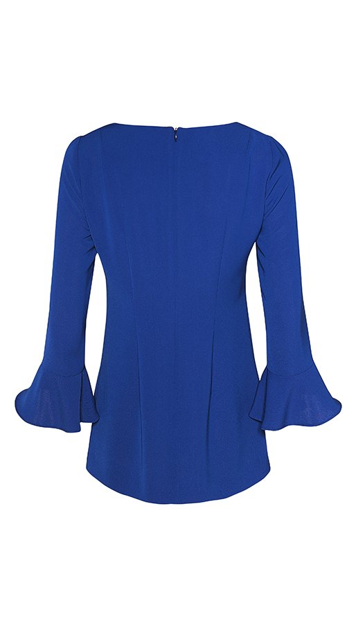 Tunic in beautiful sapphirine colour. 3/4 length sleeves with frilled cuffs. Hidden zippper closure on the back. Combining this tunic with classy trousers will make a perfect outfit for work or evening meeting.