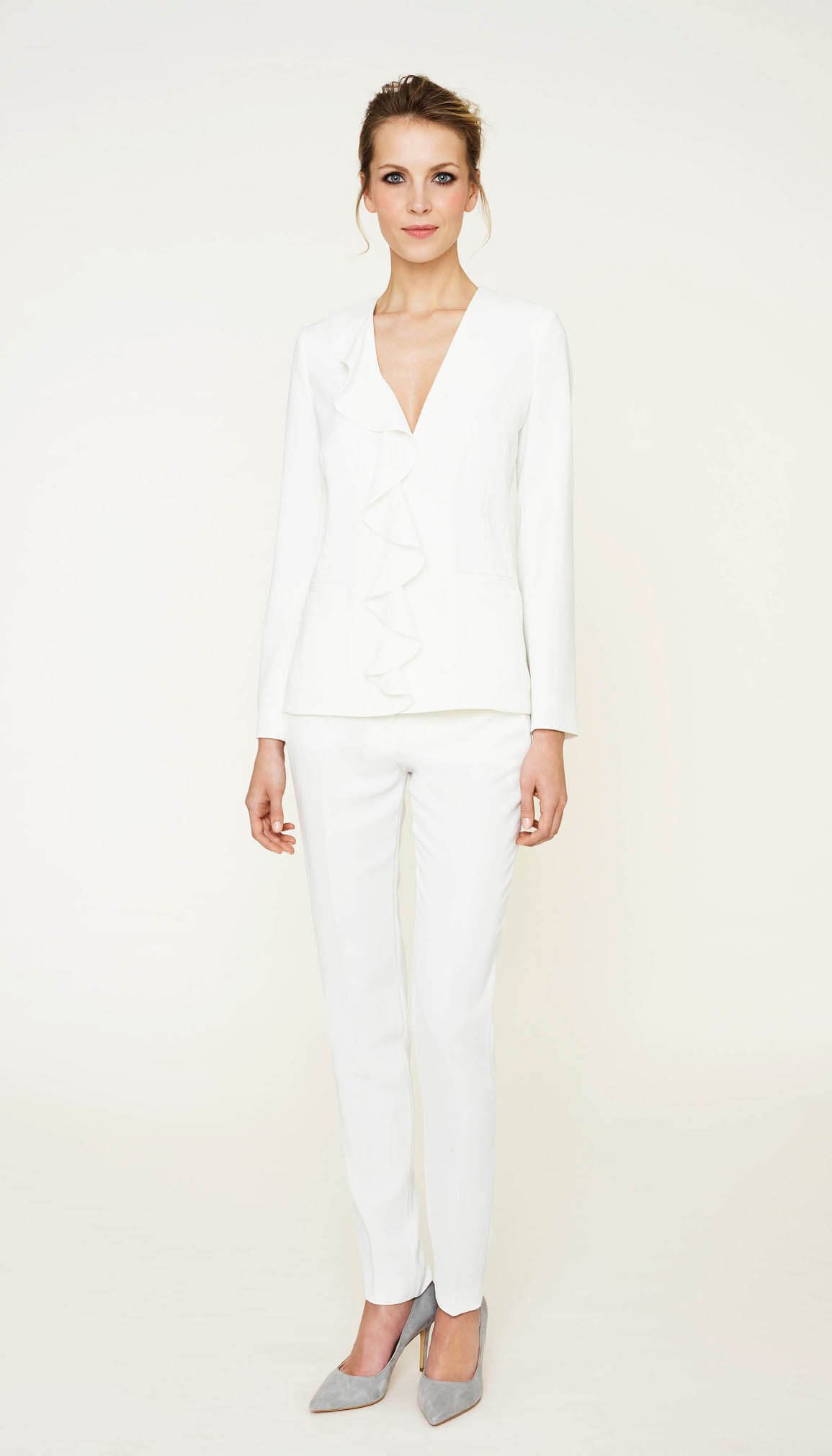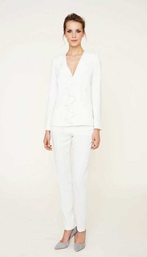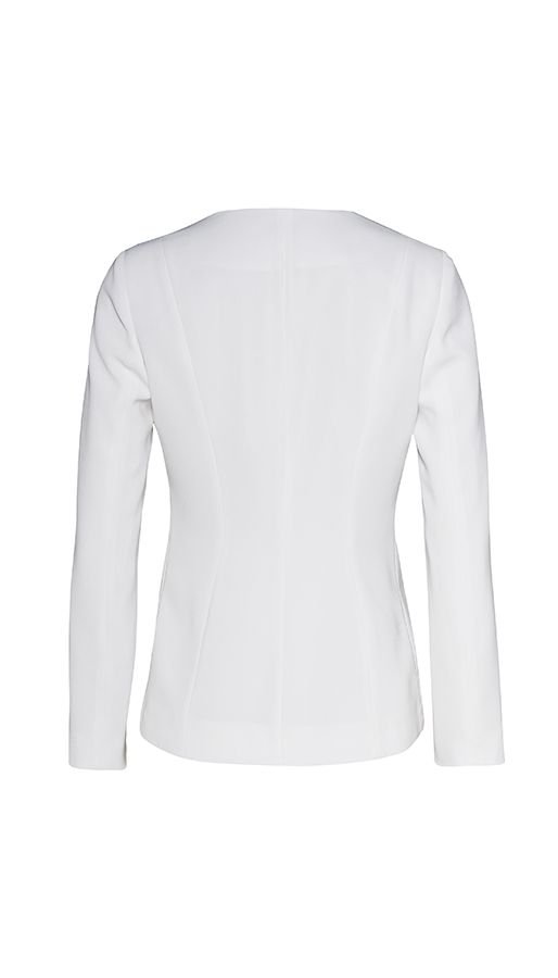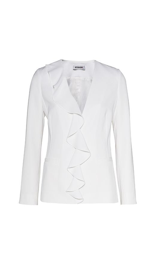 Elegant v-neck jacket which slenderise the silhoutte. A frill on the front, fitted waist. One snap closure.